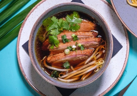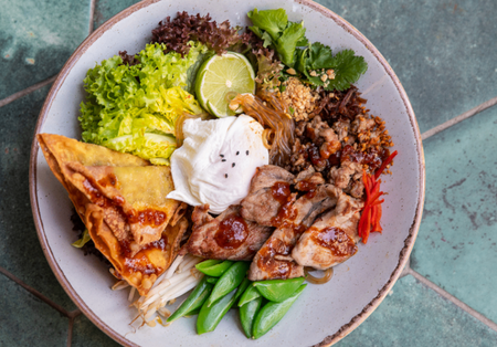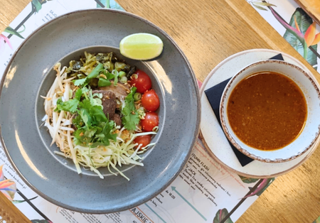 Danie na korzennym bulionie, z makaronem ryżowym, pak choi, kiełkami, kolendrą i mięsem do wyboru, podawane z limonką. Możliwość zamówienia ze sztućcami.