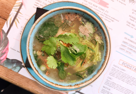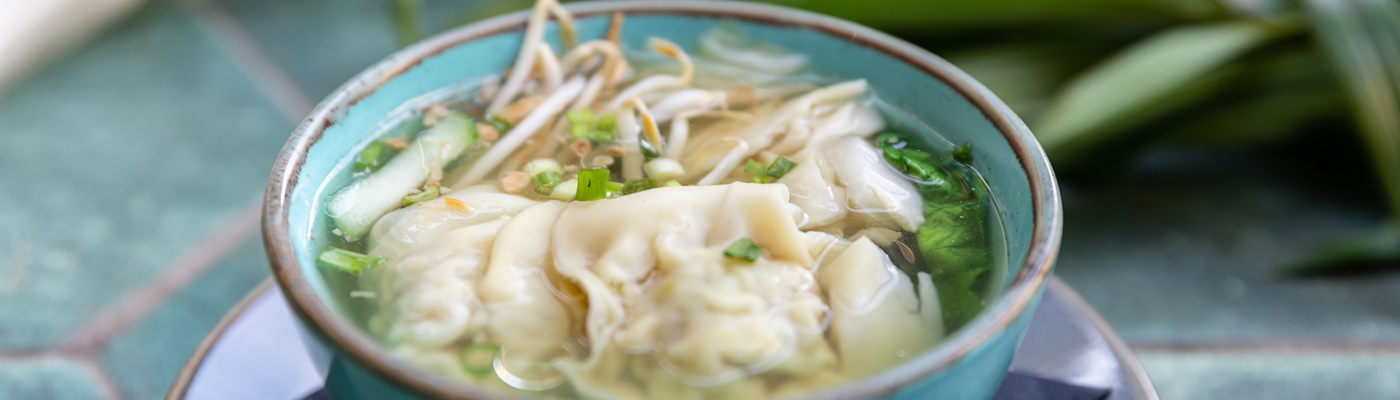 Bulion z delikatnymi pierożkami z farszem z kurczaka, z czosnkiem i kolendrą, kapusta pak choi, kolendra, kiełki fasoli mung, szczypiorek. Możliwość zamówienia ze sztućcami.