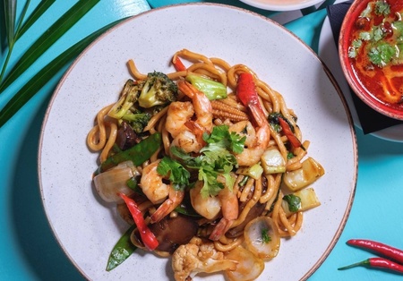 Makaron pszenny, sos sojowy, sos ostrygowy, brokuły, kalafior, młoda kukurydza, grzyby shiitake, pak choi, groszek cukrowy, chilli, tajska bazylia, kolendra, ze składnikiem do wyboru. Możliwość zamówienia ze sztućcami.