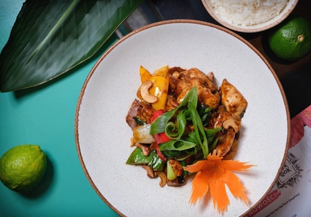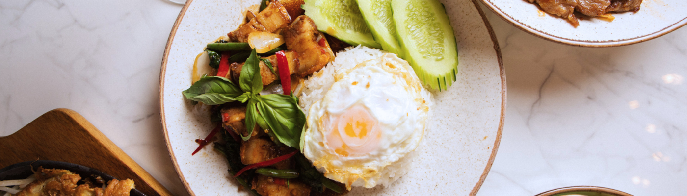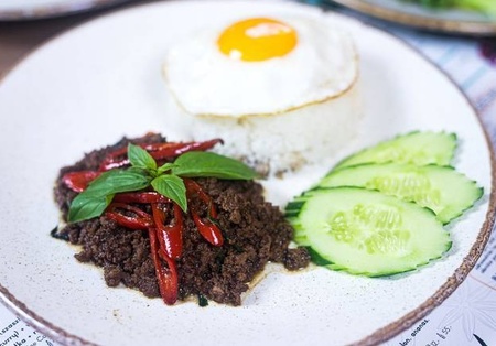 Drobno siekane mięso, smażone z tajską bazylią i chilli, zielona fasolka, jajko sadzone, ryż jaśminowy, z mięsem do wyboru. Możliwość zamówienia ze sztućcami.