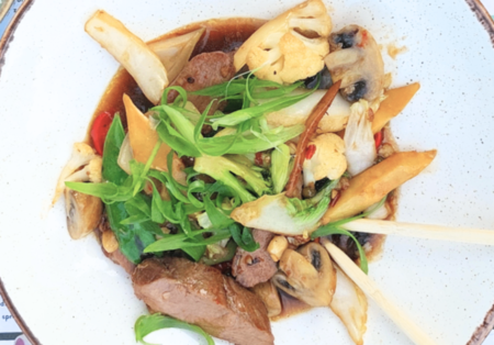 Kaczka smażona z sosem z zielonego pieprzu, kalafior, brokuł, młoda kukurydza, pędy bambusa, cebula, pieczarki, pak choi, groszek cukrowy, szczypiorek, fingerrot, sos ostrygowy, ryż jaśminowy