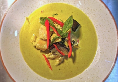 Zielone curry z mlekiem kokosowym, bakłażan, młoda kukurydza, pędy bambusa, tajska bazylia, chilli, liście kaffiru, ryż jaśminowy, z mięsem do wyboru. Możliwość zamówienia ze sztućcami.