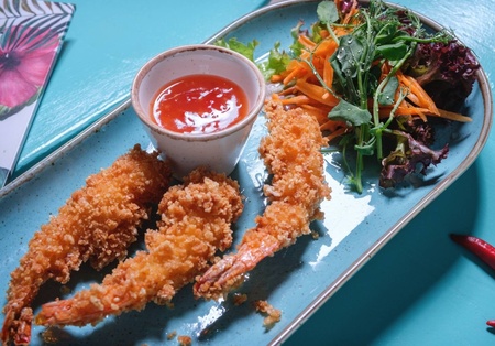 Krewetki w tempurze, warzywa Julienne, sos Sweet Chilli. Możliwość zamówienia ze sztućcami.