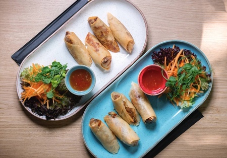 Świeże warzywa i kiełki z siekanymi orzeszkami ziemnymi, zawinięte w papier ryżowy, z sosem śliwkowym. Możliwość zamówienia ze sztućcami.