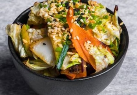 Brokuły, kalafior, marchewka, młoda kukurydza, groszek cukrowy, pak choi, pieczarki, czosnek, imbir, sos sojowy i ostrygowy, szczypiorek i kiełki. Możliwość zamówienia ze sztućcami.