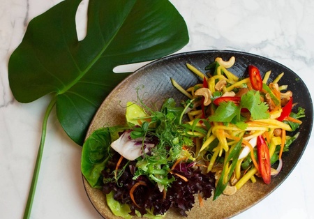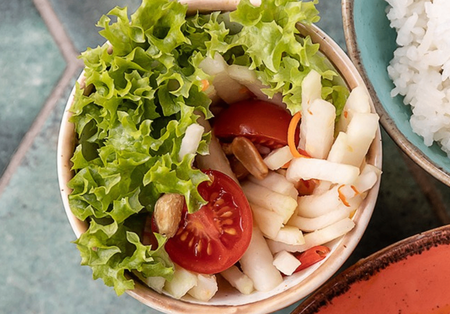 Zielone mango, marchew, cebula czerwona, świeże chilli, orzechy nerkowca, sok z limonki, kolendra, szczypiorek, sos rybny. Możliwość zamówienia ze sztućcami.