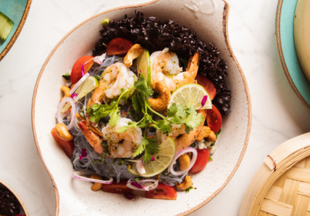 sałatka z krewetkami i makaronem sojowym, czerwona cebula, kolendra, szczypiorek, pomidorki koktajlowe, orzechy nerkowca, kwaśny sos