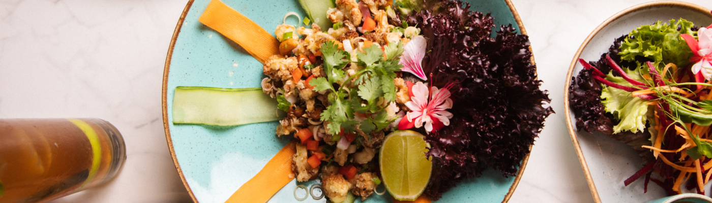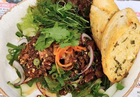 grillowana polędwica wołowa z przyprawą z prażonego ryżu Khao Kua, chilli, kaffiru, galangalu, sosu rybnego i czosnku. kolendra. mięta. tajska bazylia. szczypiorek. czerwona cebula. sałata, ogórek, ziołowa grzanka