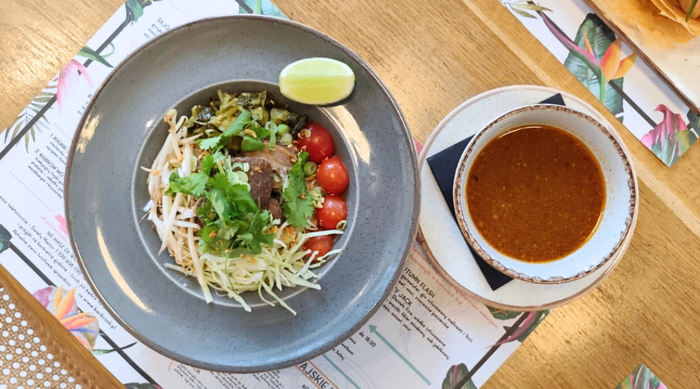 Pomidorowe curry z wołowiną z mostka, makaronem ryżowym, marynowaną kapustą i kiełkami mung, szczypiorek, kolendra