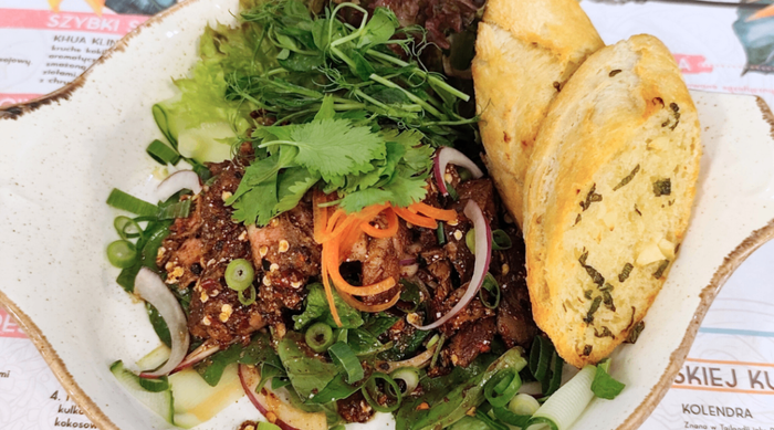 grillowana polędwica wołowa z przyprawą z prażonego ryżu Khao Kua, chilli, kaffiru, galangalu,