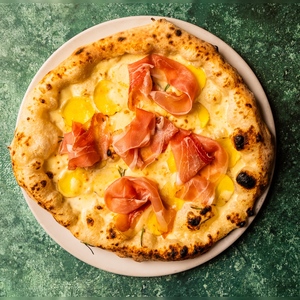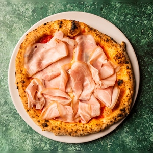 sos z pomidorów pelami, grana padano, mozzarella fior di latte, prosciutto cotto