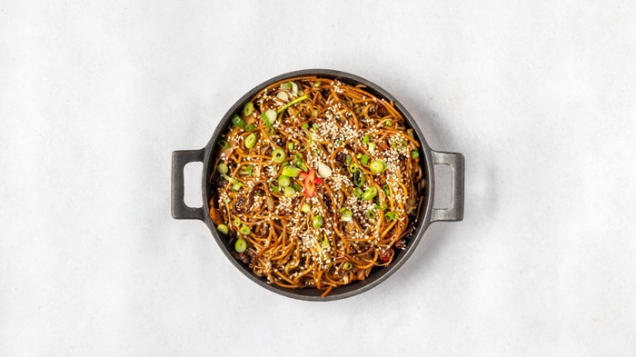 Makaron pełnoziarnisty, wołowina, pędy bambusa, kapusta biała, marchew, imbir, czosnek, cebula, szczypiorek, sezam, sos sojowy ostry.