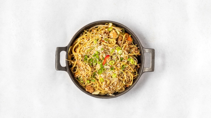 Makaron jajeczny, kurczak, kapusta biała, marchew, imbir, czosnek, cebula, szczypiorek, sezam, sos teriyaki.