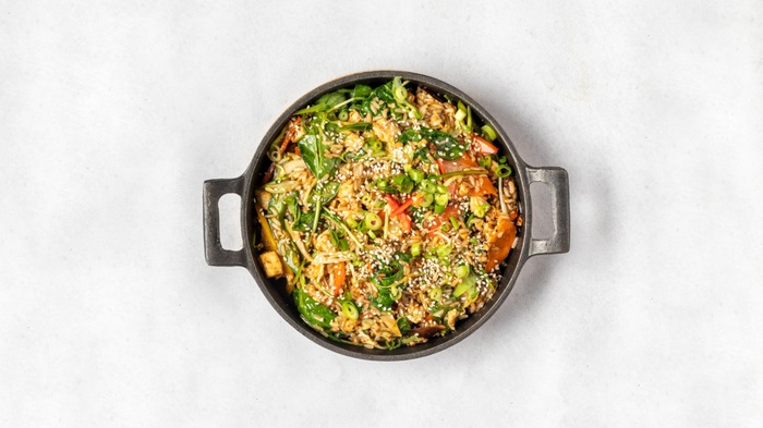 Makaron ryżowy, szpinak, pomidorki koktailowe, grzyby shiitake, mix papryk, kapusta biała, marchew, imbir, czosnek, cebula, szczypiorek, sezam, chili, bezglutenowy sojowy