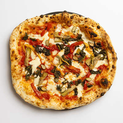 sos z pomidorów San Marzano DOP, mozzarella fior di latte, karczochy alla romana, marynowane jabłko kaparowe, grillowana papryka, neapolitańskie friarielli, grana padano DOP