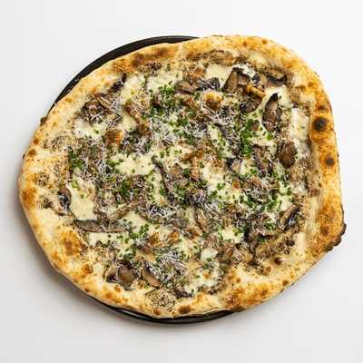 krem z czarnej trufli, mozzarella fior di latte, grzyby portobello, pieczarki brunatne, oliwa truflowa, szczypiorek, pecorino romano DOP, mieszanka grzybów leśnych w zalewie